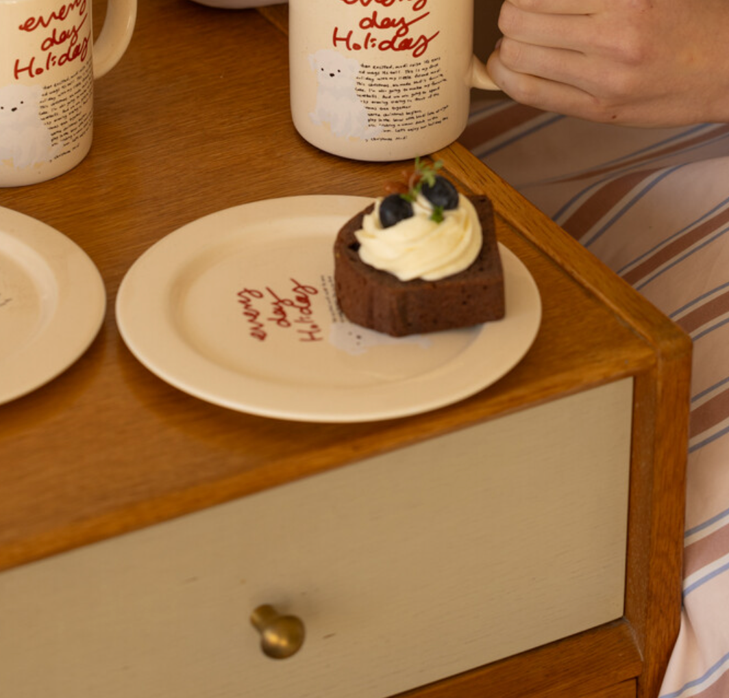 This round plate features a cute puppy illustration. This classic round plate captures Mom's unique holiday spirit. Enjoy a delightful weekend with a variety of desserts, including cakes and bread.