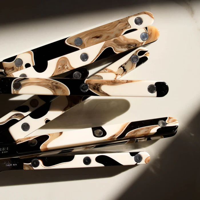 When designing this cutlery we wanted to faithfully capture the atmosphere while adding a modern touch: the styling is simple, the rivets are visible, while the colours and materials stand out nicely. From red to blue, not forgetting the superb materials with horn or tortoise effects. Available with gloss or vintage finishes, we’re sure you’ll enjoy this collection, which is designed to be both traditional and contemporary at the same time.