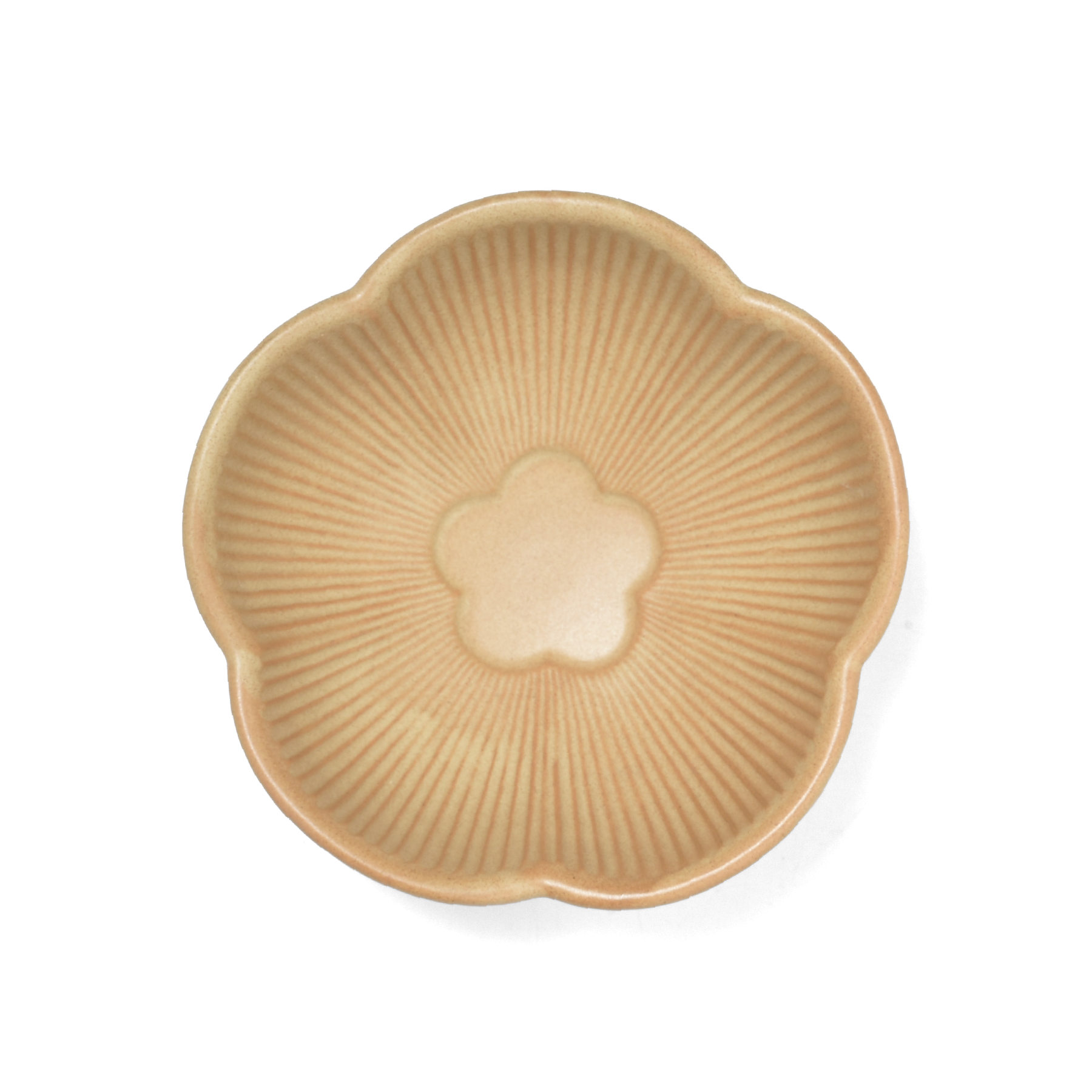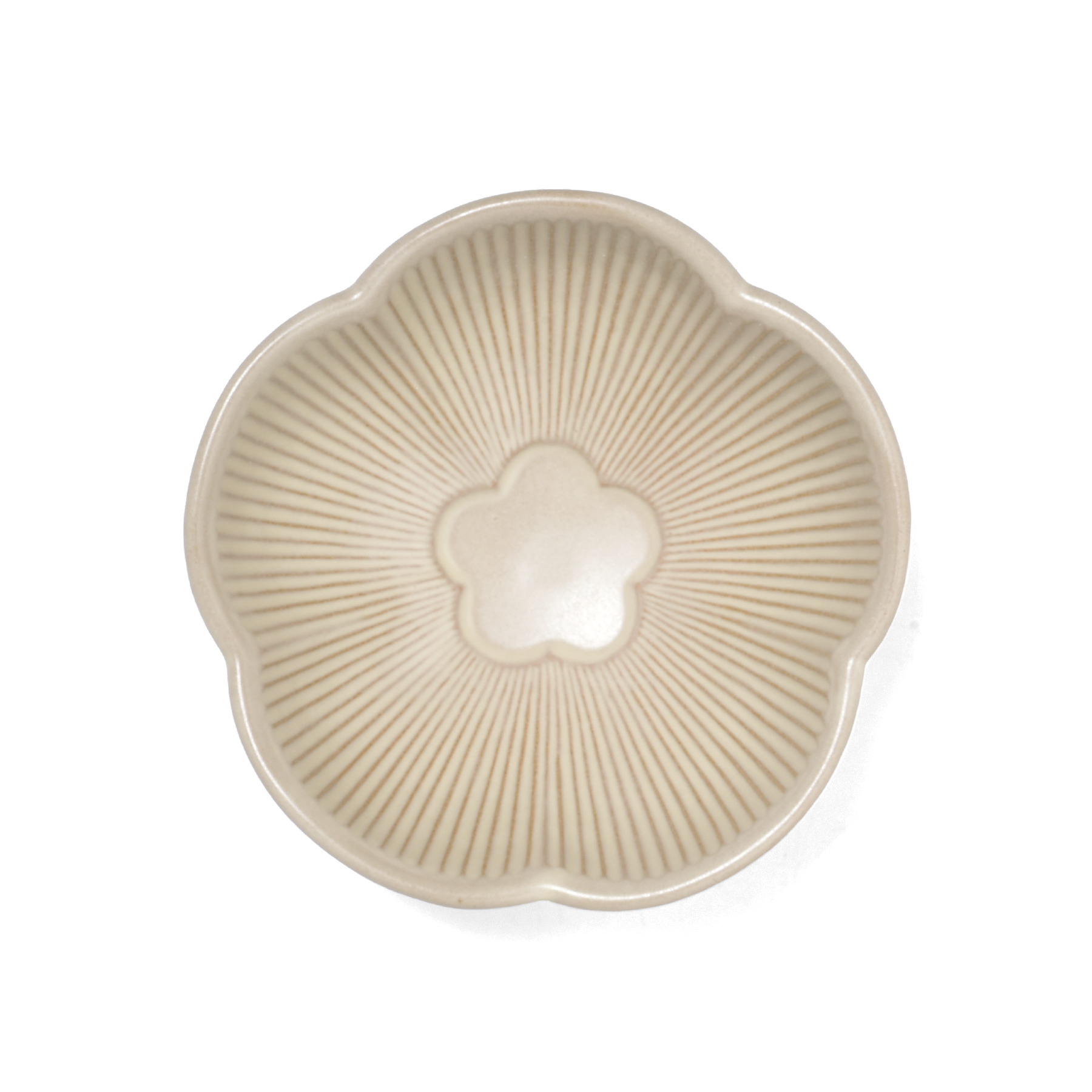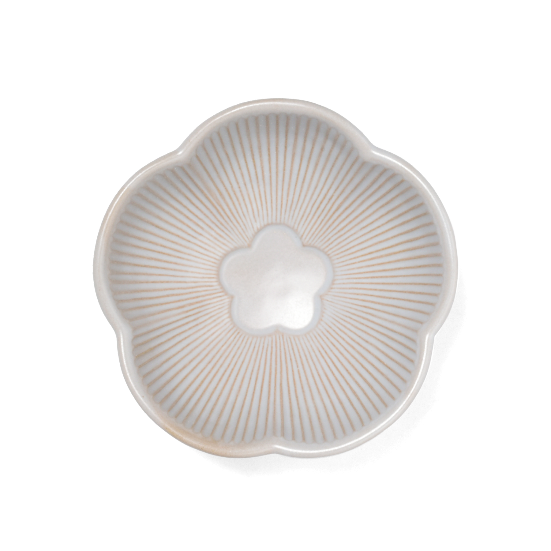 "Fleuron" in French refers to floral decoration. The Ume (Japanese apricot) flower-shaped bowl looks plump and adorable in a bit compelling way. This flowery bowl will make the arranged food look nicer and prettier. It has been designed and made to encourage you to make delicious food by using seasonal ingredients. We are most particular about this beautiful and deep relief consisting of as many as 200 lines on the surface, and our highly-skilled artisan deserves credit for that. We intended to make the relief look most beautiful when it is glazed, and as a result, we got a relief to be engraved very deeply.